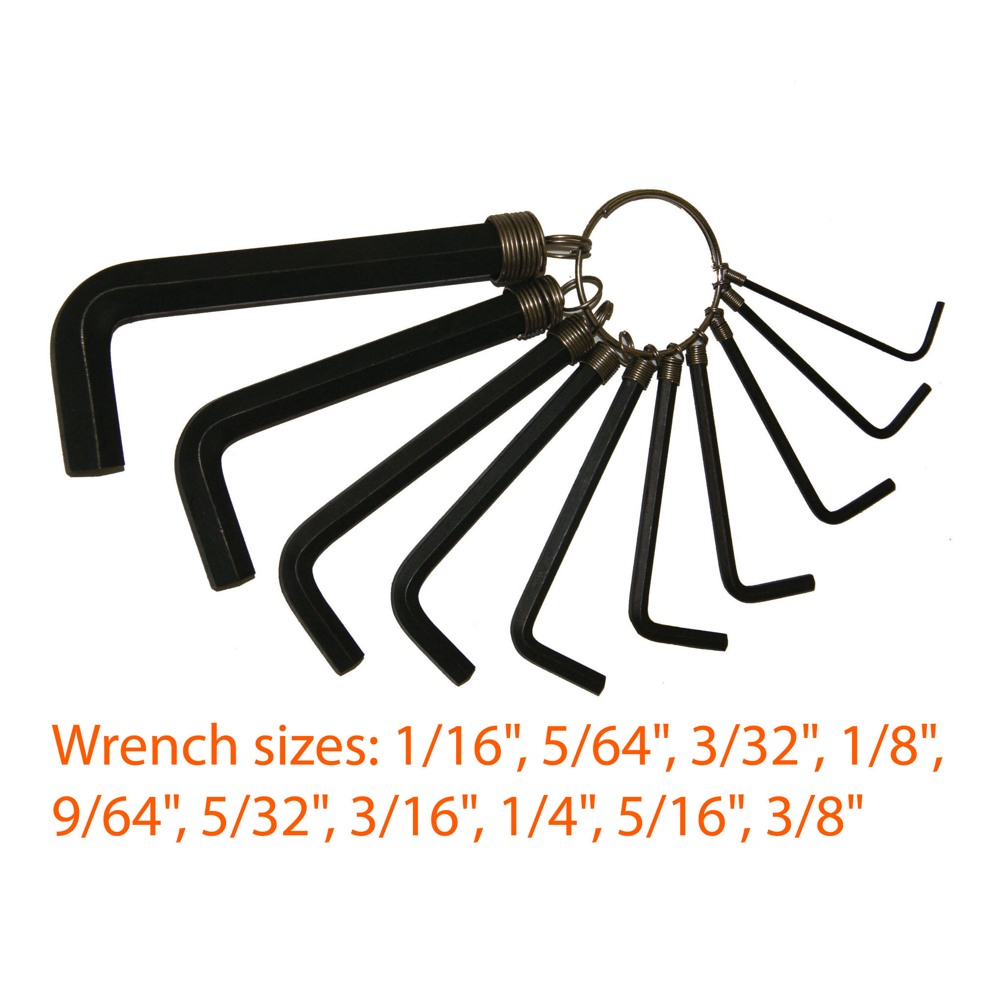 Wrench sizes: 1/16″, 5/64″, 3/32″, 1/8″, 9/64″, 5/32″, 3/16″, 1/4″, 5/16″, 3/8″[linebreak]Extruded carbon steel construction[linebreak]Heat treated[linebreak]Black oxide finished for durability[linebreak]Convenient ring organizer