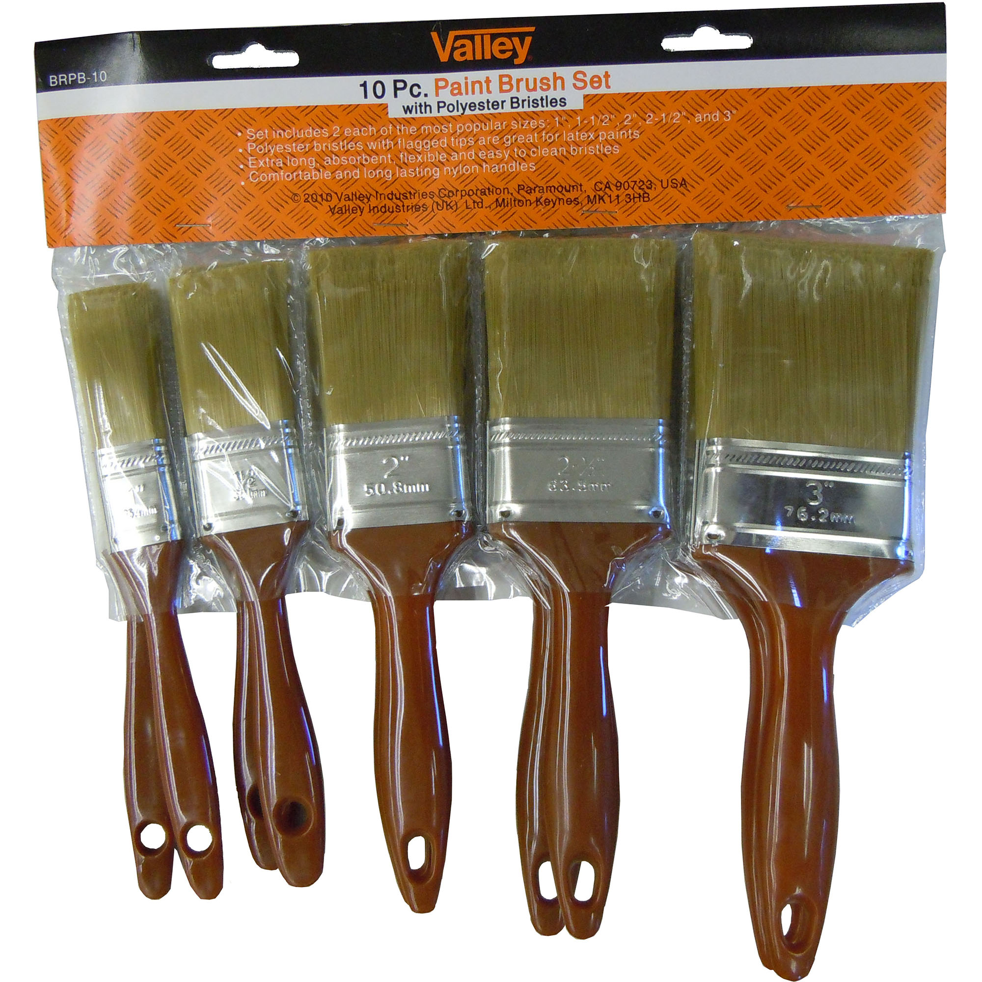 Set includes 2 each of the most popular sizes: [linebreak] 1″, 1-1/2″, 2″, 2-1/2″, and 3″[linebreak]Polyester bristles with flagged tips are great for latex paints[linebreak]Extra long, absorbent, flexible and easy to clean bristles[linebreak]Comfortable and long lasting nylon handles