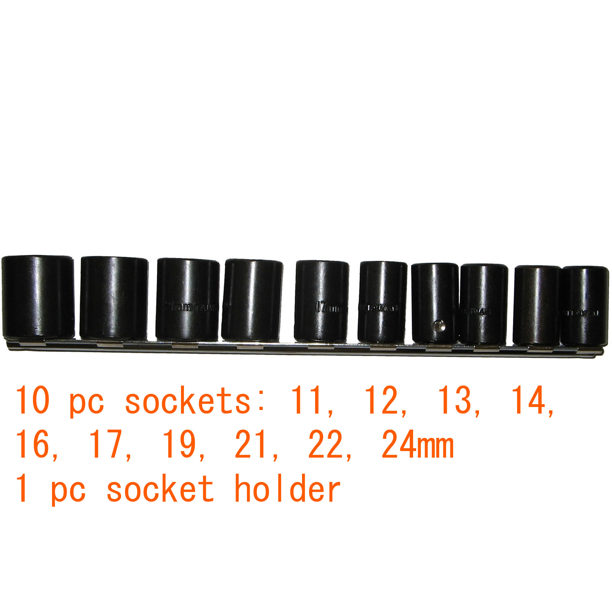 10 pc sockets: 11, 12, 13, 14, 16, 17, 19, 21, 22, 24mm[linebreak]1 pc socket holder