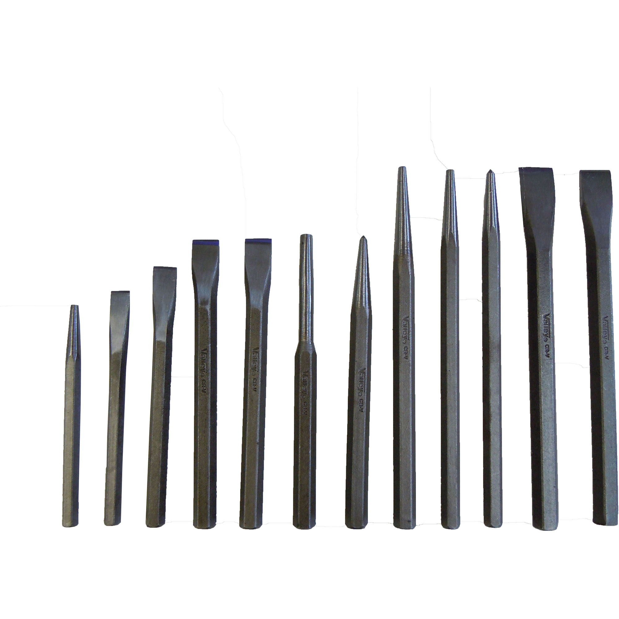 Drop forged heat treated CR-V steel[linebreak]Precision ground and polished blades[linebreak]Corrosion resistant sand blasted finish[linebreak]Heavy duty hex stock shanks[linebreak]Complete with roll-up canvas storage pouch[linebreak]Contains:[linebreak] 6 pc. Cold chisel:[linebreak] 1/2″ X 6-1/2″ / 12 X 165mm, 5/8″ X 7″ / 16 X 175mm[linebreak] 3/4″ X 8″ / 19 X 200mm, 13/16″ X 8″ / 20 X 200mm[linebreak] 7/8″ X 10″ / 22 X 250mm, 1″ X 10″ / 25 X 250mm [linebreak] 3 pc. taper punch:[linebreak] 1/8″ X 6″ / 3 X 150mm, 1/4″ X 10″ / 6 X 250mm[linebreak] 3/8″ X 10″ / 10 X 250mm[linebreak] 2 pc. center punch:[linebreak] 5/16″ X 8″ / 8 X 200mm, 1/4″ X 10″ / 6 X 250mm [linebreak] 1 pc. pin punch:[linebreak] 3/8″ X 8″ / 10 X 200mm