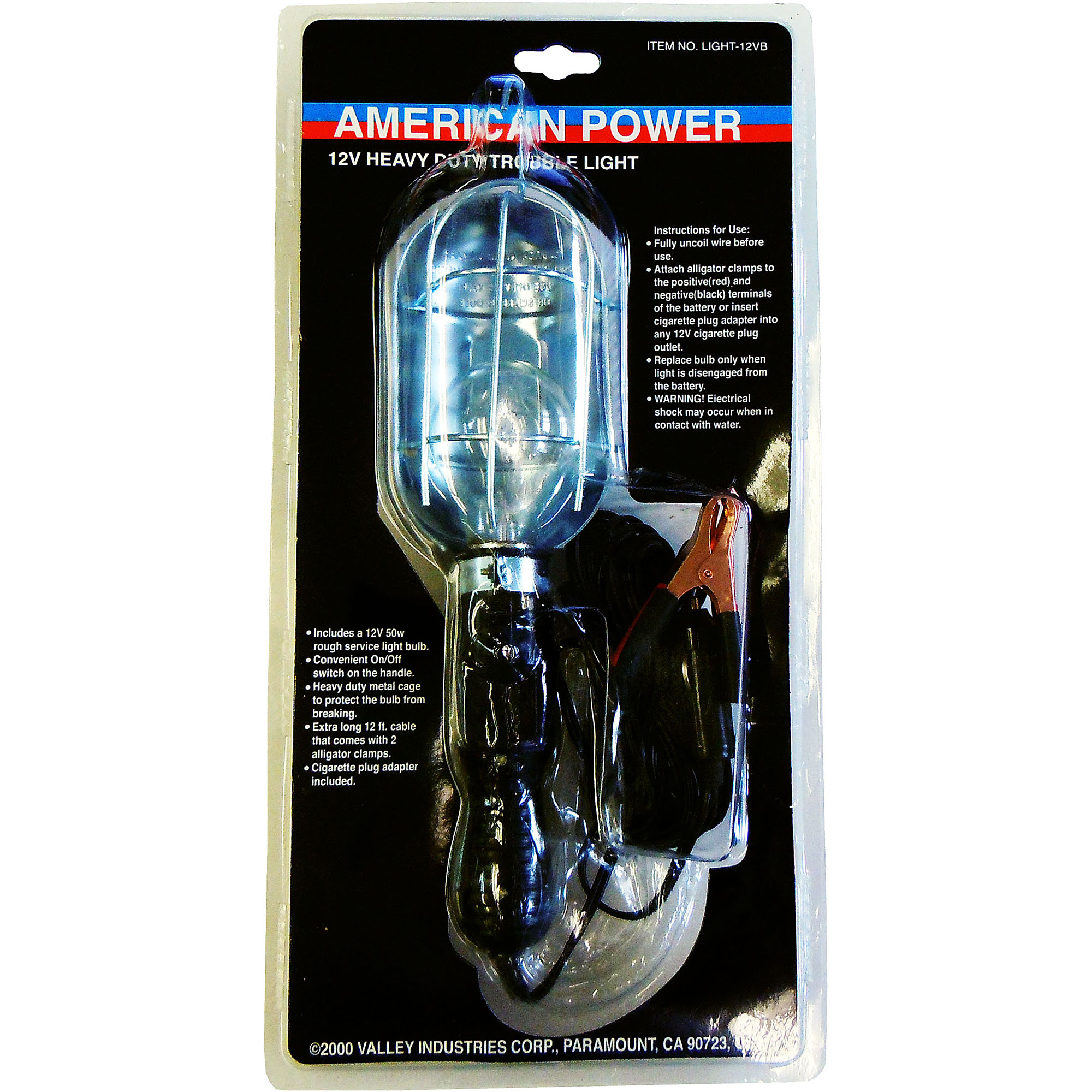 Includes a 12V 50W rough service light bulb[linebreak]Convenient On / Off switch on the handle[linebreak]Heavy duty metal cage to protect the bulb from breaking[linebreak]Extra long 12ft. Cable that comes with 2 alligator clamps[linebreak]Cigarette plug adapter included