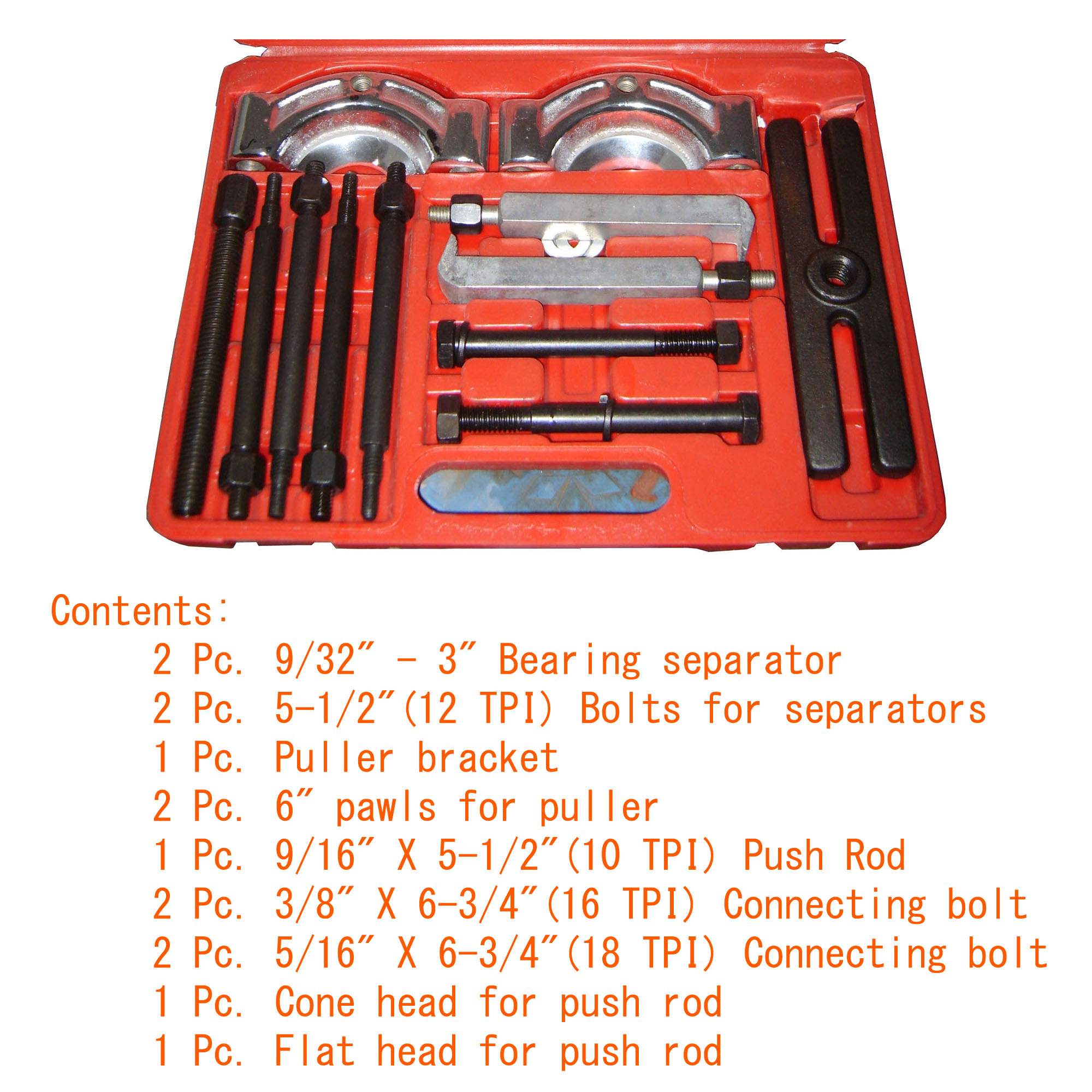 Drop forged, heat treated steel attachments[linebreak]Hardened and tempered precision machined bolts[linebreak]Removes gears, pulleys, and steering wheels[linebreak]Smoothly separates bearings[linebreak]Contents:[linebreak] 2 Pc. 9/32″ – 3″ Bearing separator[linebreak] 2 Pc. 5-1/2″(12 TPI) Bolts for separators[linebreak] 1 Pc. Puller bracket[linebreak] 2 Pc. 6″ pawls for puller[linebreak] 1 Pc. 9/16″ X 5-1/2″(10 TPI) Push Rod[linebreak] 2 Pc. 3/8″ X 6-3/4″(16 TPI) Connecting bolt[linebreak] 2 Pc. 5/16″ X 6-3/4″(18 TPI) Connecting bolt[linebreak] 1 Pc. Cone head for push rod[linebreak] 1 Pc. Flat head for push rod[linebreak]Blow mold storage case