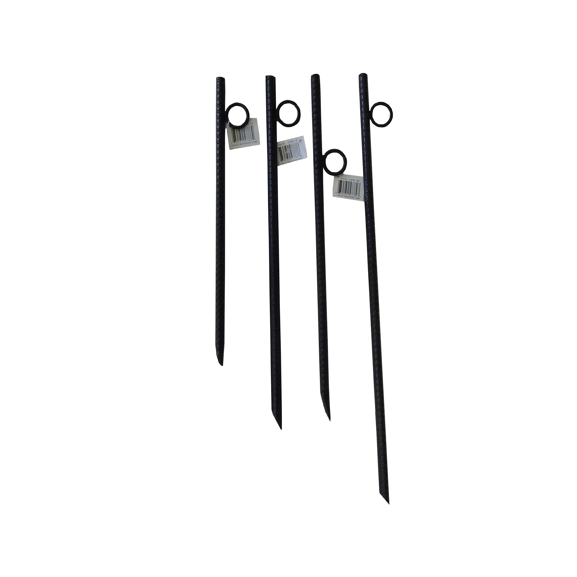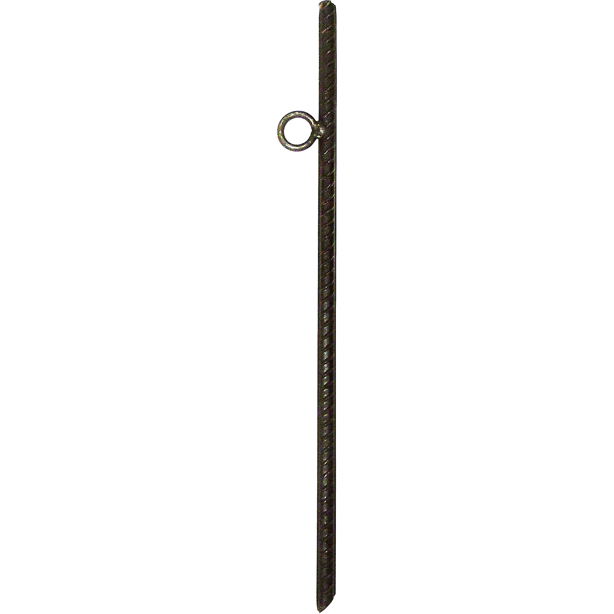 Made from 5/8″ diameter, #5 rebar[linebreak]45 Degree angle cut end for easy insertion[linebreak]Round eye welded on for securing attachments