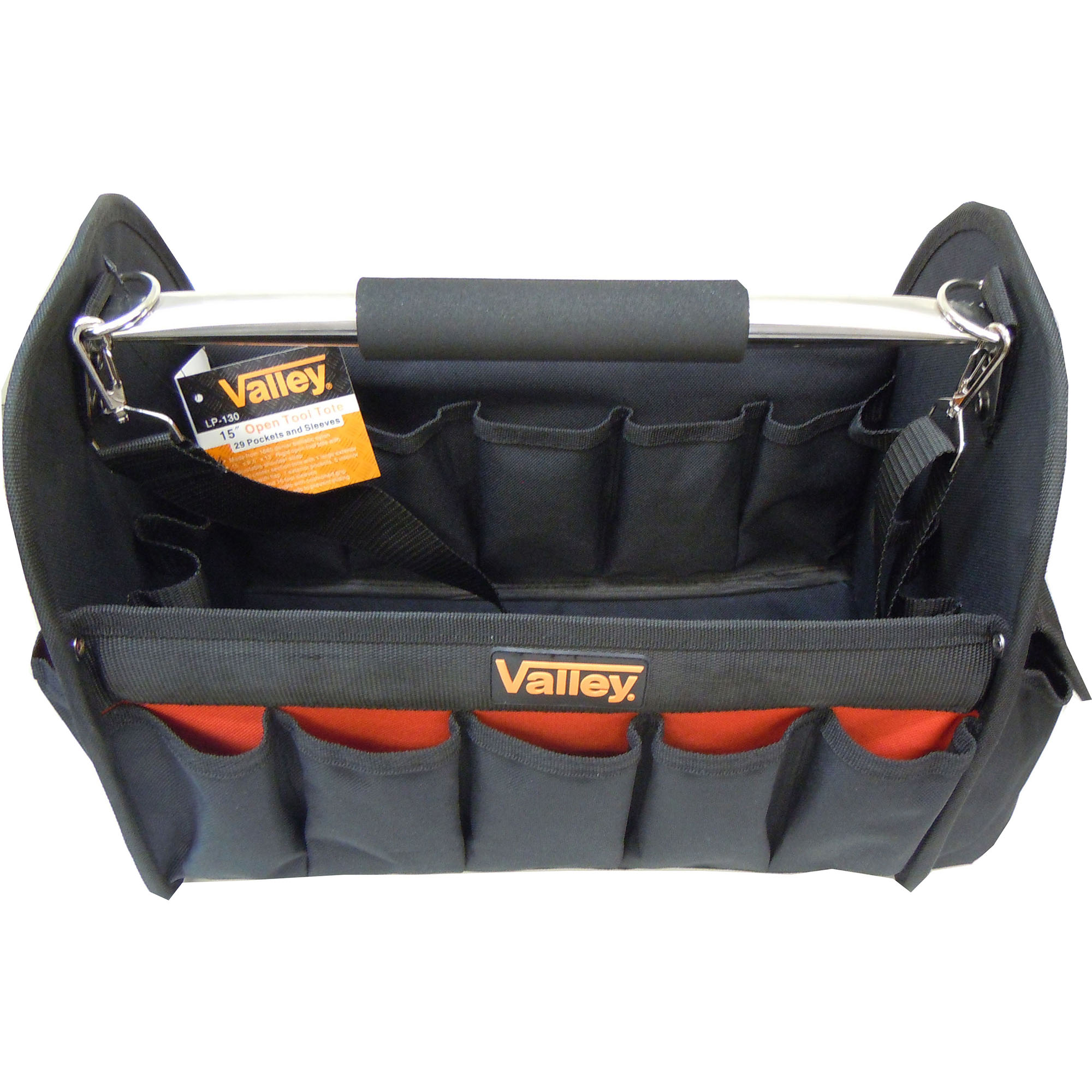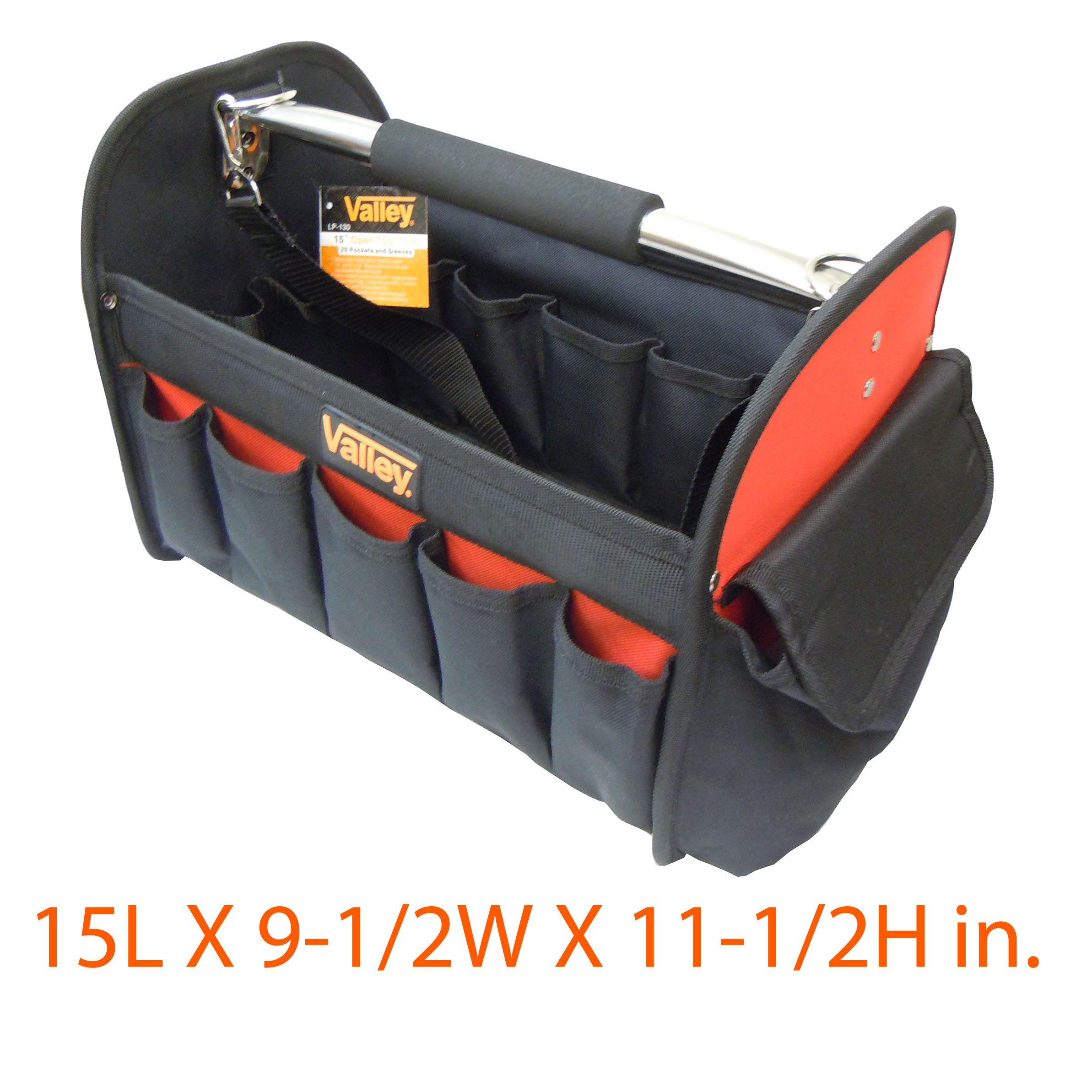 Made from 1680 denier ballistic nylon[linebreak]15″ x 8.5″ x 12″ Rigid open tool tote with adjustable shoulder strap[linebreak]Open center section tote with 1 large exterior pocket with flap, 7 exterior pockets, 5 interior pockets, and 16 tool sleeves[linebreak]Heavy duty handle with cushioned grip[linebreak]Rubberized foot pads to prevent sliding