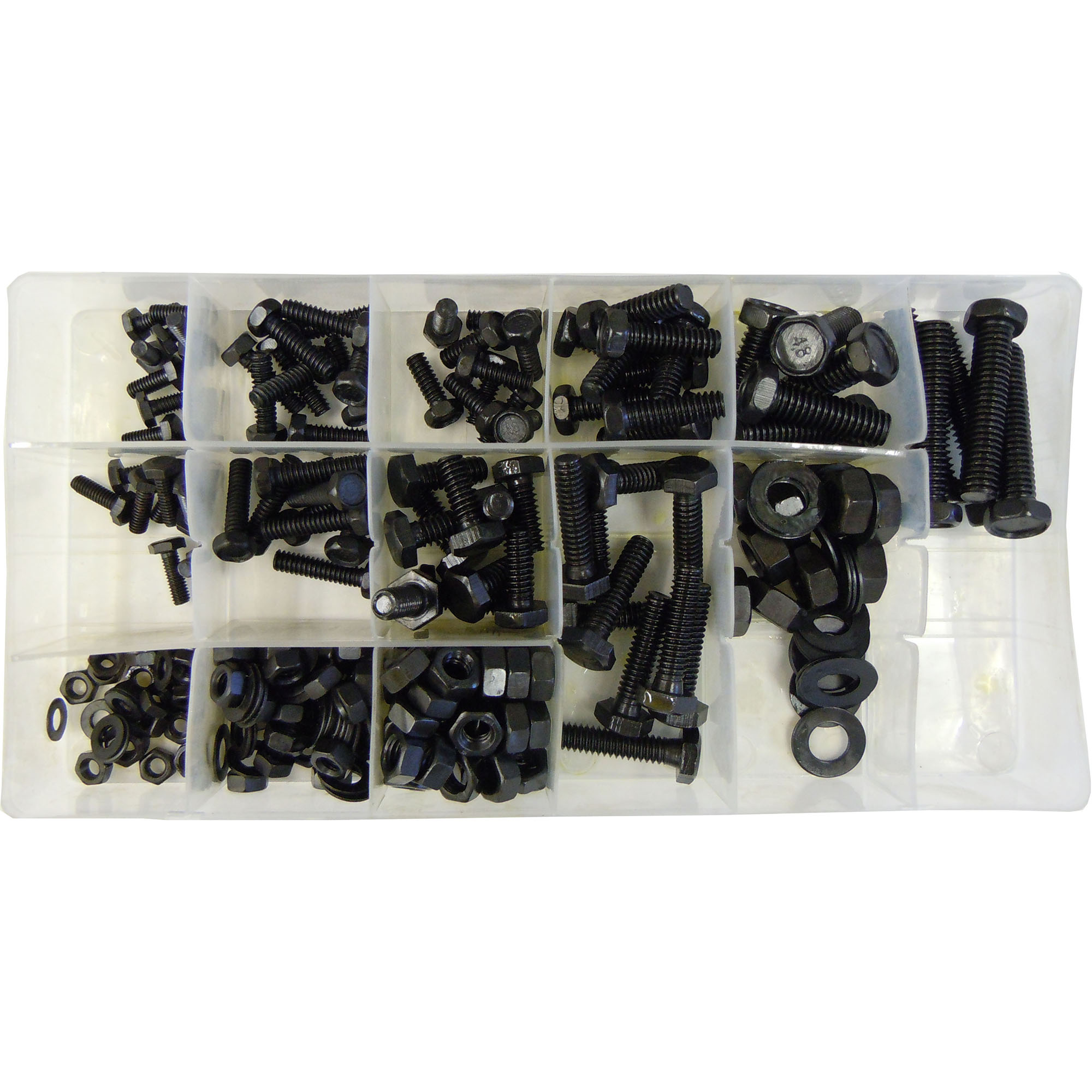 Contains an assortment of the most common hex bolts with nuts and washers[linebreak]Black oxide finish for corrosion resistance[linebreak]Assortment contains:[linebreak] #8 – 36 X 3/8″ 10 Pc. #10 – 32 X 1/2″ 10 Pc. 1/4″ – 20 X 3/4″ 10 Pc. 5/16″ – 18 X 1″ 5 Pc.[linebreak] #8 – 36 X 1/2″ 10 Pc. #10 – 32 X 5/8″ 10 Pc. 1/4″ – 20 X 5/8″ 10 Pc. 5/16″ – 18 X 1-1/2″ 5 Pc.[linebreak] #8 – 36 Nut 20 Pc. #10 – 32 X 3/4″ 10 Pc. 1/4″ – 20 X 1″ 10 Pc. 5/16″ – 18 Nut 10 Pc.[linebreak] #8 Washer 20 Pc. #10 – 32 Nut 30 Pc. 1/4″ – 20 Nut 30 Pc. 5/16″ Washer 20 Pc.[linebreak] #10 Washer 30 Pc. 1/4″ Washer 30 Pc.[linebreak]Convenient re-sealable plastic storage case