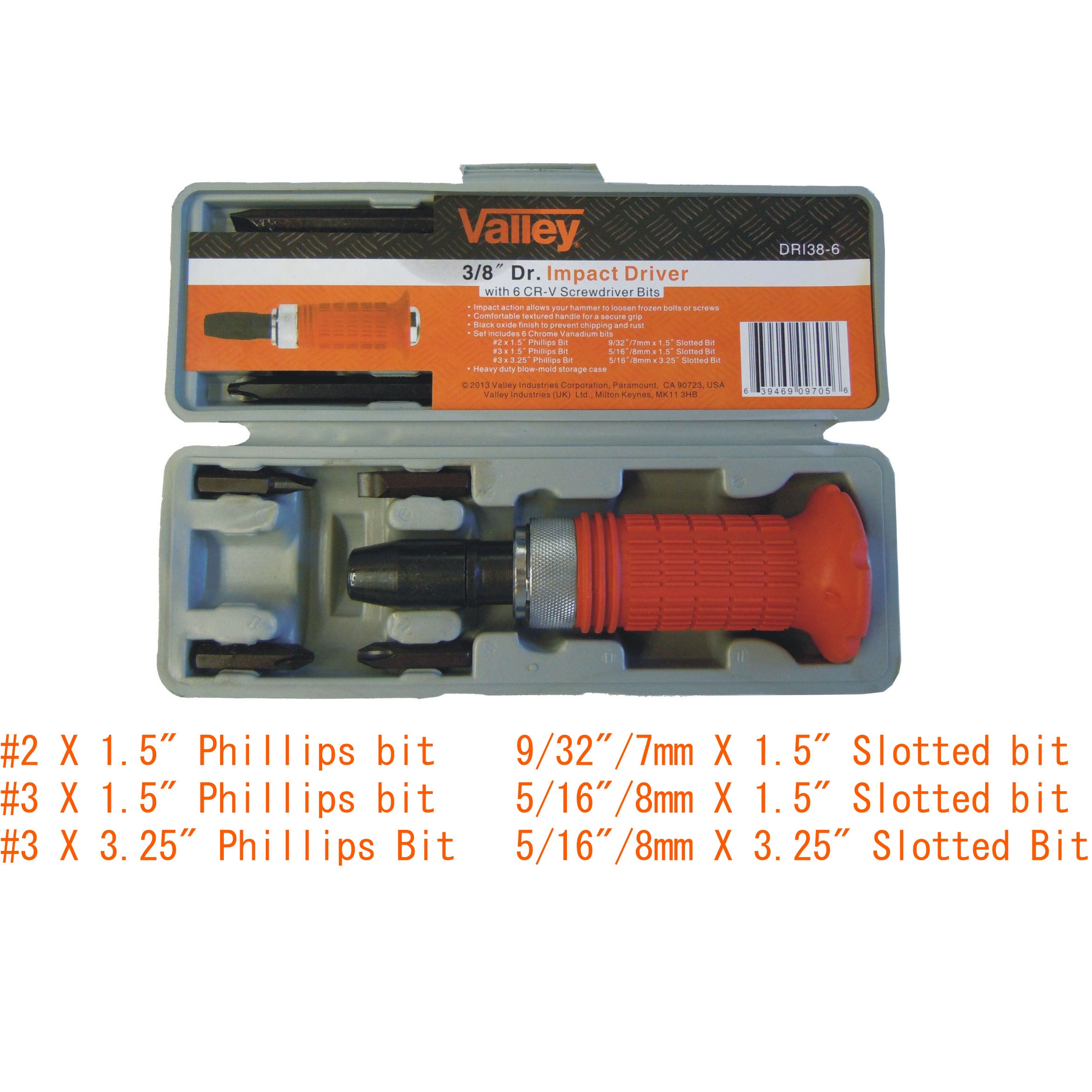 Impact action allows your hammer to loosen frozen bolts or screws[linebreak]Comfortable textured handle for a secure grip[linebreak]Black oxide finish to prevent chipping and rust[linebreak]Set includes 6 Chrome Vanadium bits[linebreak]#2 X 1.5″ Phillips bit 9/32″/7mm X 1.5″ Slotted bit[linebreak]#3 X 1.5″ Phillips bit 5/16″/8mm X 1.5″ Slotted bit[linebreak]#3 X 3.25″ Phillips Bit 5/16″/8mm X 3.25″ Slotted Bit[linebreak]Heavy duty blow-mold storage case
