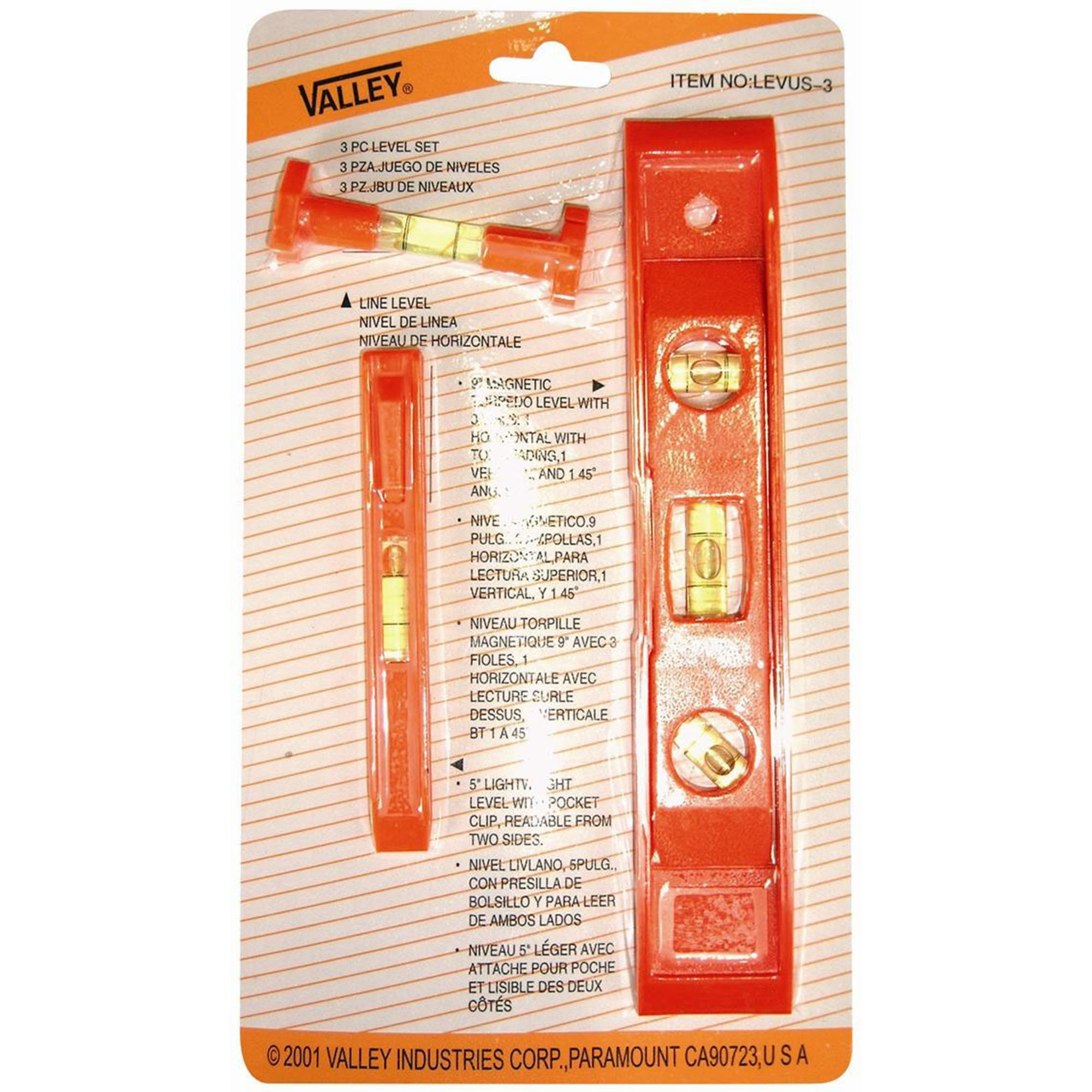 Contains:[linebreak] Line level[linebreak] 9″ magnetic torpedo level with 3 vials: [linebreak] 1 horizontal with top reading, 1 vertical, and 1 45 degree angle[linebreak] 5″ lightweight level with pocket clip, readable from two sides