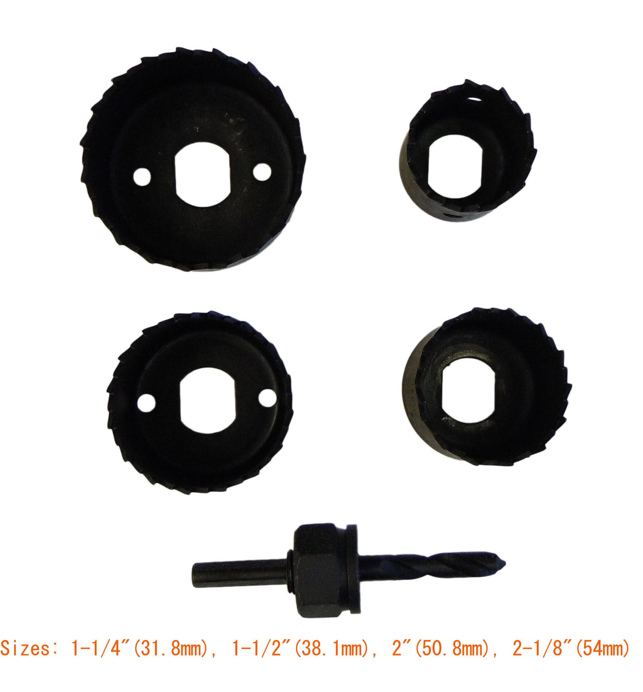 1 Pc. 1/4″(6.35mm) mandrel[linebreak]4 Pc. Popular hole saw blades designed for wood, composition, and plastic applications[linebreak]Sizes: 1-1/4″(31.8mm), 1-1/2″(38.1mm), 2″(50.8mm), 2-1/8″(54mm)