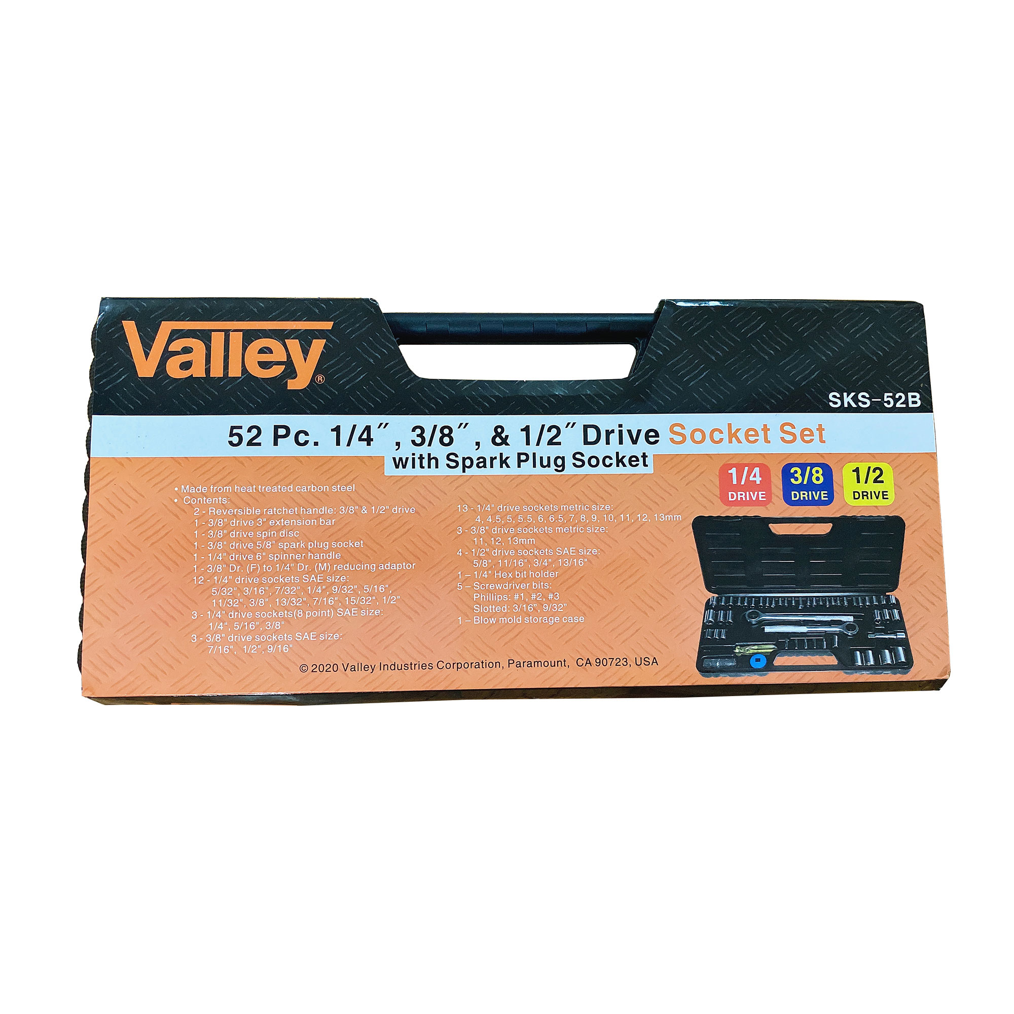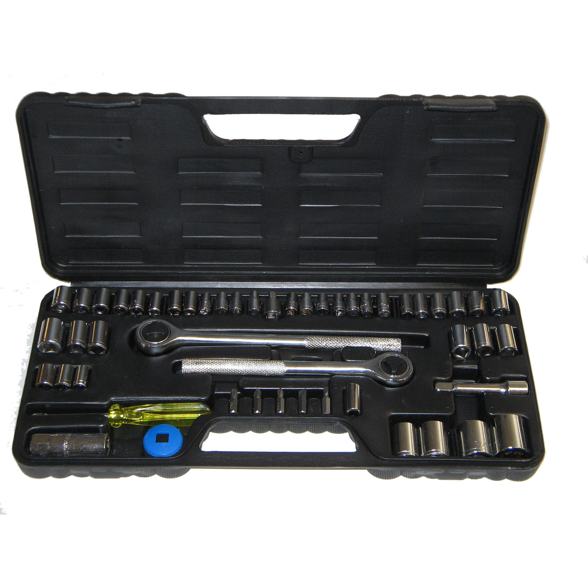 Contents:[linebreak] 2 – Reversible ratchet handle: 3/8″ & 1/2″ drive[linebreak] 1 – 3/8″ drive 3″ extension bar[linebreak] 1 – 3/8″ drive spin disc[linebreak] 1 – 3/8″ drive 5/8″ spark plug socket[linebreak] 1 – 6″ spinner handle[linebreak] 1 – 1/4″(M) X 3/8″(F) adaptor[linebreak] 12 – 1/4″ drive sockets SAE size:[linebreak] 5/32″, 3/16″, 7/32″, 1/4″, 9/32″, 5/16″, [linebreak] 11/32″, 3/8″, 13/32″, 7/16″, 15/32″, 1/2″[linebreak] 3 – 1/4″ drive sockets(8 point) SAE size:[linebreak] 1/4″, 5/16″, 3/8″[linebreak] 3 – 3/8″ drive sockets SAE size:[linebreak] 7/16″, 1/2″, 9/16″[linebreak] 13 – 1/4″ drive sockets metric size:[linebreak] 4, 4.5, 5, 5.5, 6, 6.5, 7, 8, 9, 10, 11, 12, 13mm[linebreak] 3 – 3/8″ drive sockets metric size:[linebreak] 11, 12, 13mm[linebreak] 4 – 1/2″ drive sockets SAE size:[linebreak] 5/8″, 11/16″, 3/4″, 13/16″[linebreak] 1 – Coupler[linebreak] 5 – Bits:[linebreak] Phillips: #1, #2, #3[linebreak] Slotted: 3/16″, 9/32″[linebreak] 1 – Blow case