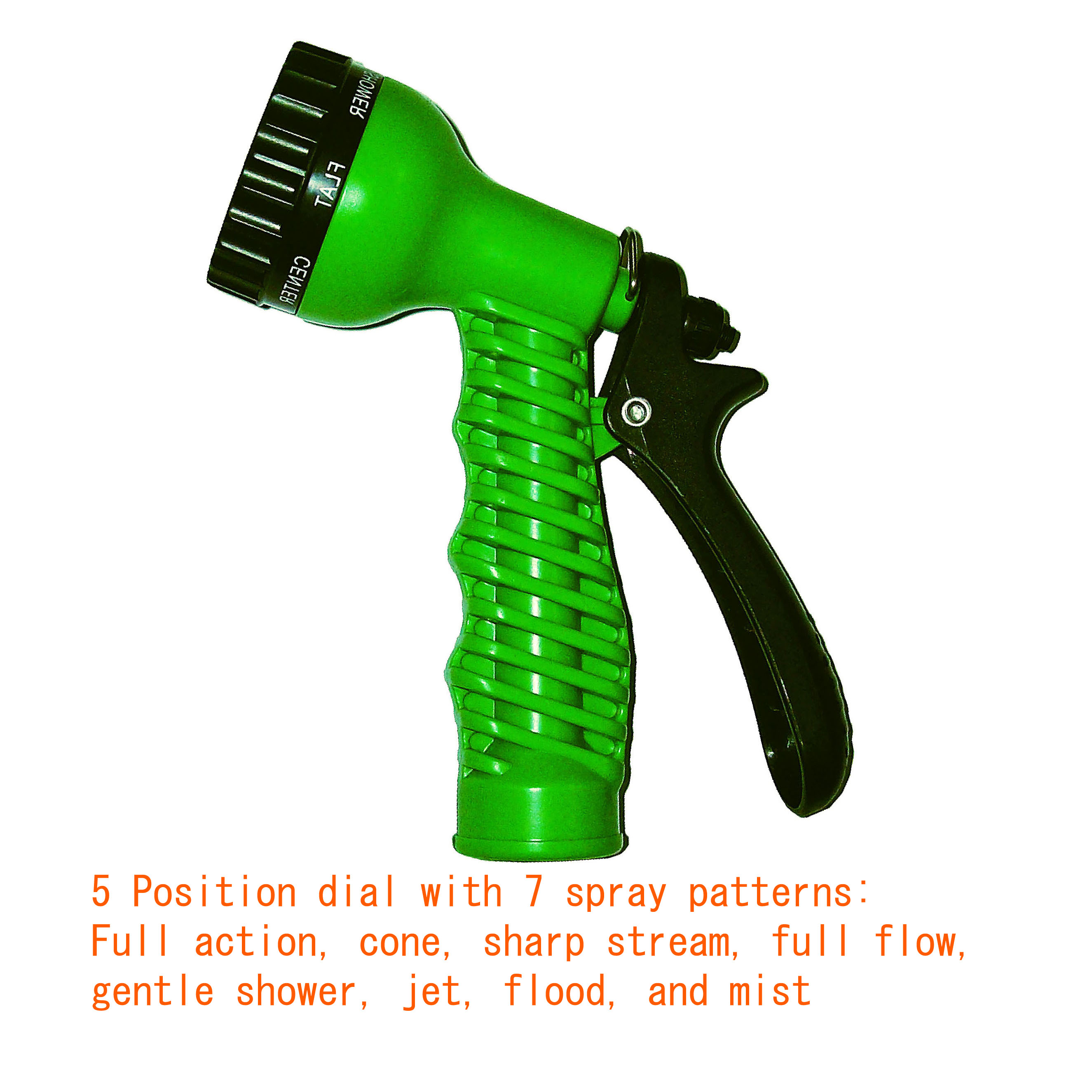 Heavy duty ABS poly body[linebreak]Comfortable pistol grip design[linebreak]5 Position dial with 7 spray patterns:[linebreak] Full action, cone, sharp stream, full flow, gentle shower, jet, flood, and mist
