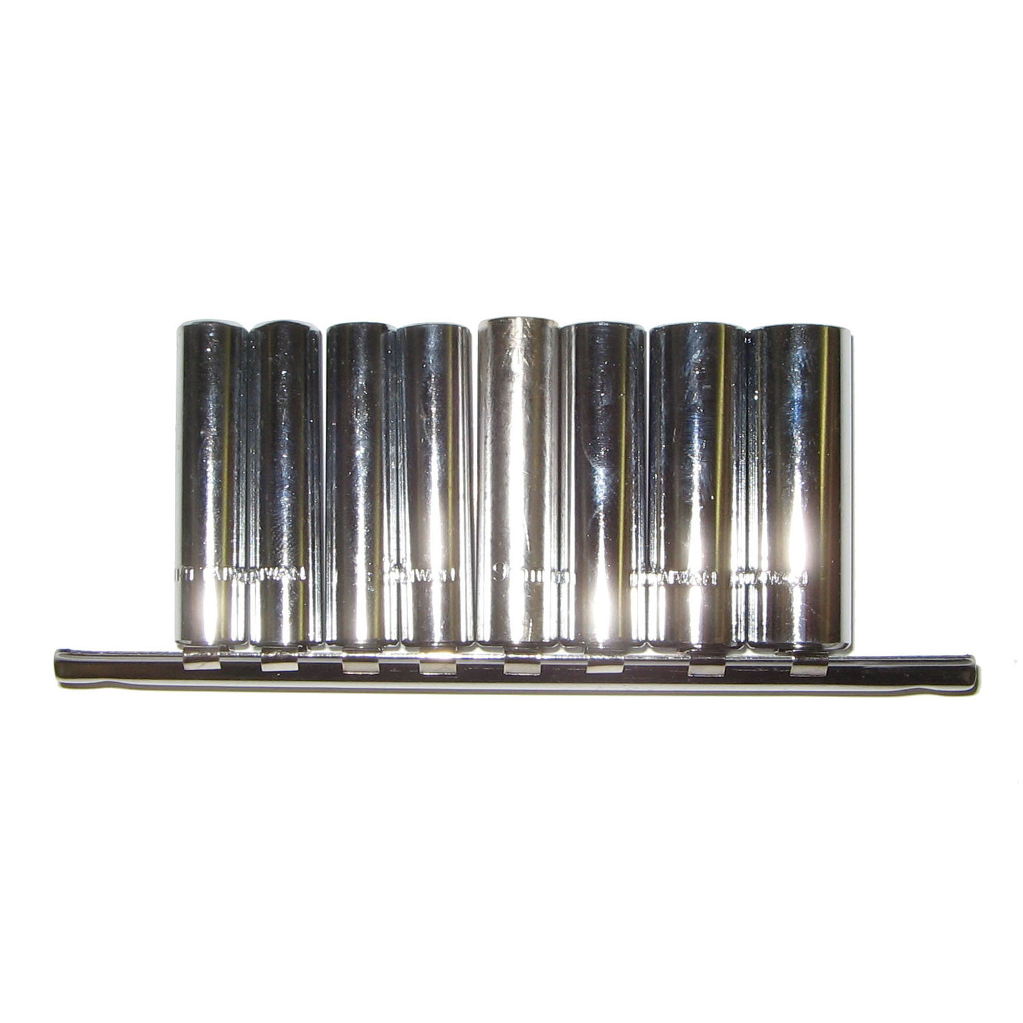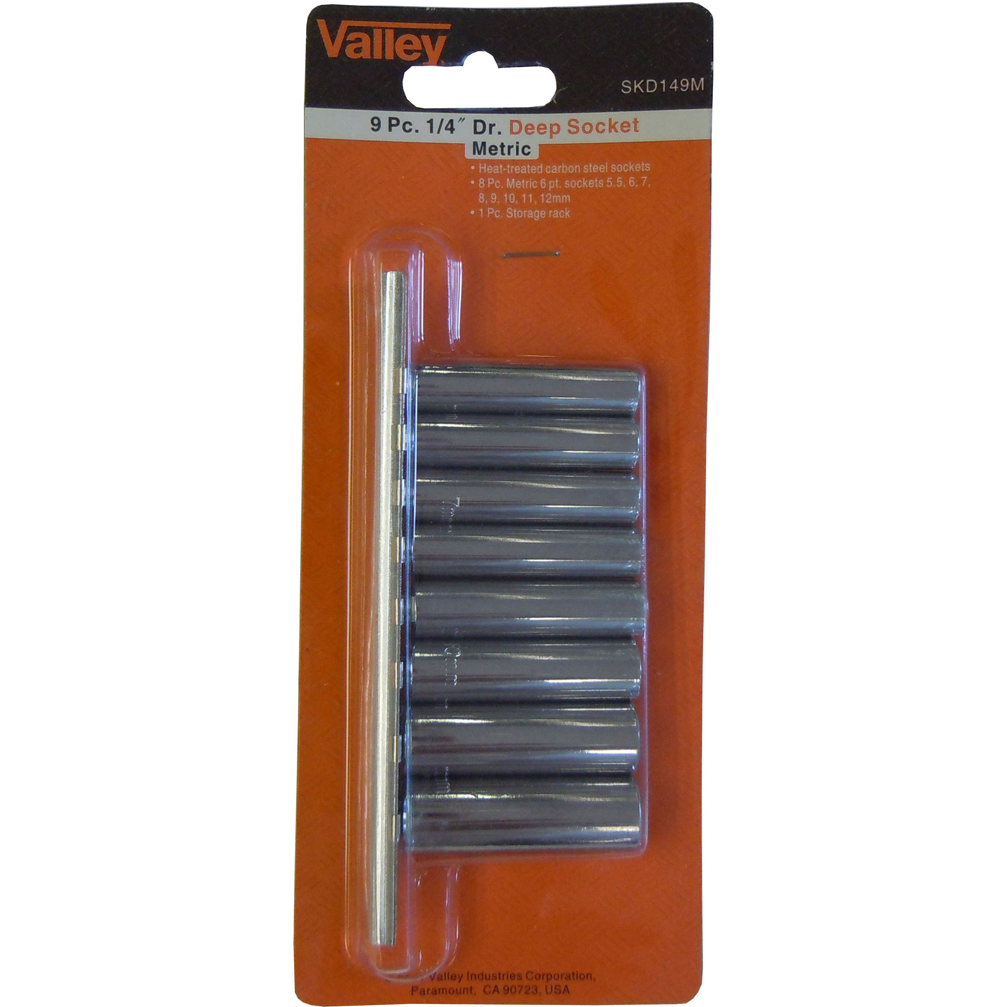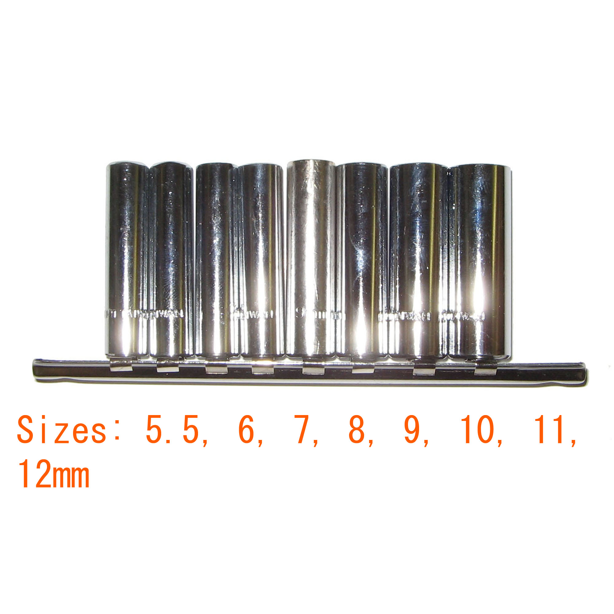 Heat-treated carbon steel sockets[linebreak]8 Pc. Metric 6 point sockets[linebreak] 5.5, 6, 7, 8, 9, 10, 11, 12mm[linebreak]1 Pc. Storage rack