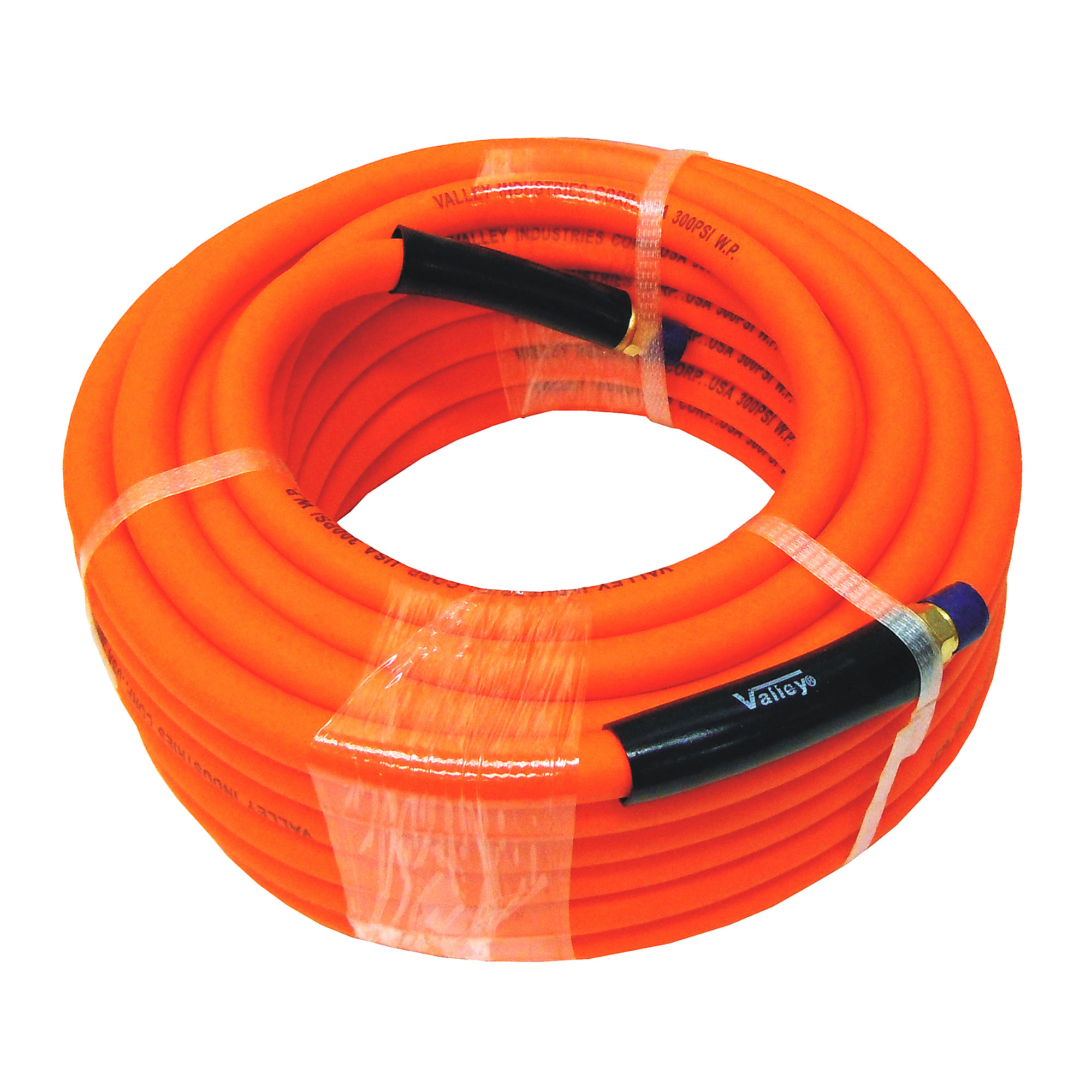 3/8″ Super flex hose[linebreak]300 PSI Working pressure[linebreak]Extreme Duty[linebreak]Thermoplastic compound jacket provides flexibility in extreme low [linebreak] temperature conditions of up to -40 degree F[linebreak]Internal rubber tube reinforced with Xtramesh™ yarn, working [linebreak] temperature range -40 degree F to 140 degree F[linebreak]Solid brass 1/4″ NPT male fittings[linebreak]Hi viz orange bend restrictors