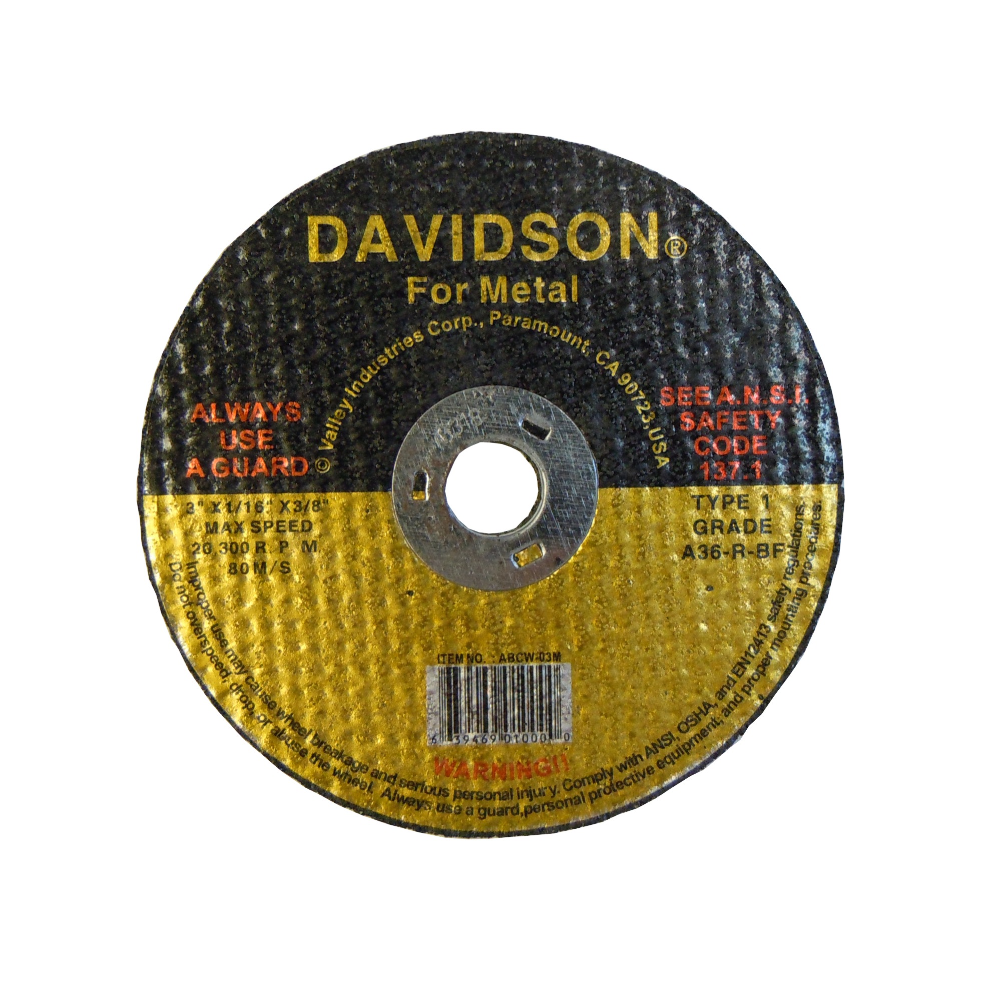 Type 1 Aluminum Oxide Metal Cut-Off Wheels are designed for metal[linebreak] cutting, metal abrasion, metal fabrication, and general repair work[linebreak]Aluminum Oxide Abrasive Blades are suitable for cutting ferrous[linebreak] metals, gray iron, stainless, non-ferrous materials, aluminum, and[linebreak] pipeline[linebreak]Max R.P.M. : 20300[linebreak]Grade A-36-SB2F[linebreak]For Metal[linebreak]3″ x 1/16″ x 3/8″