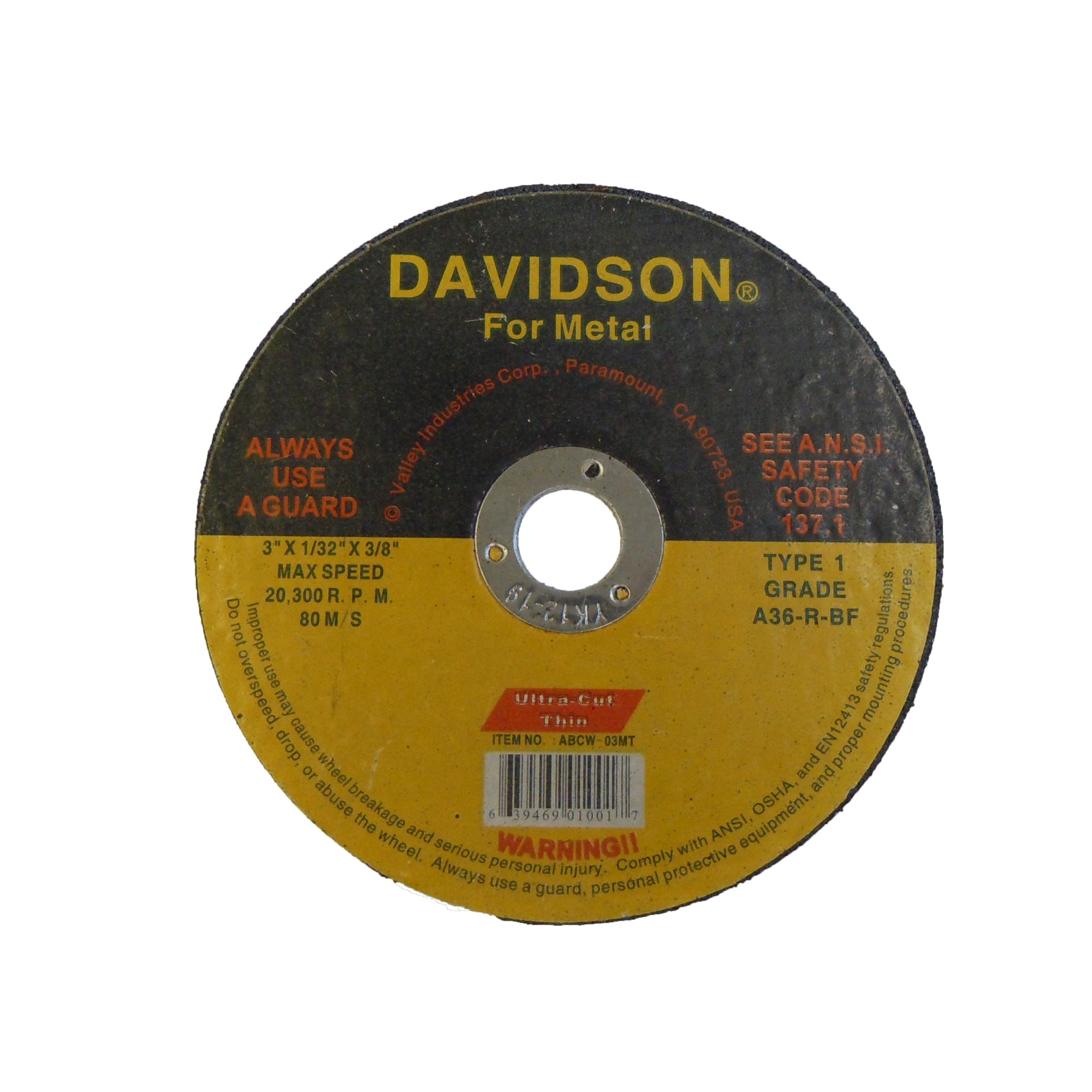 Type 1 Aluminum Oxide Metal Cut-Off Wheels are designed for metal[linebreak] cutting, metal abrasion, metal fabrication, and general repair work[linebreak]Aluminum Oxide Abrasive Blades are suitable for cutting ferrous[linebreak] metals, gray iron, stainless, non-ferrous materials, aluminum, and[linebreak] pipeline[linebreak]Max R.P.M. : 20300[linebreak]Grade A-36-SB2F[linebreak]For Metal[linebreak]3″ x 1/32″ x 3/8″